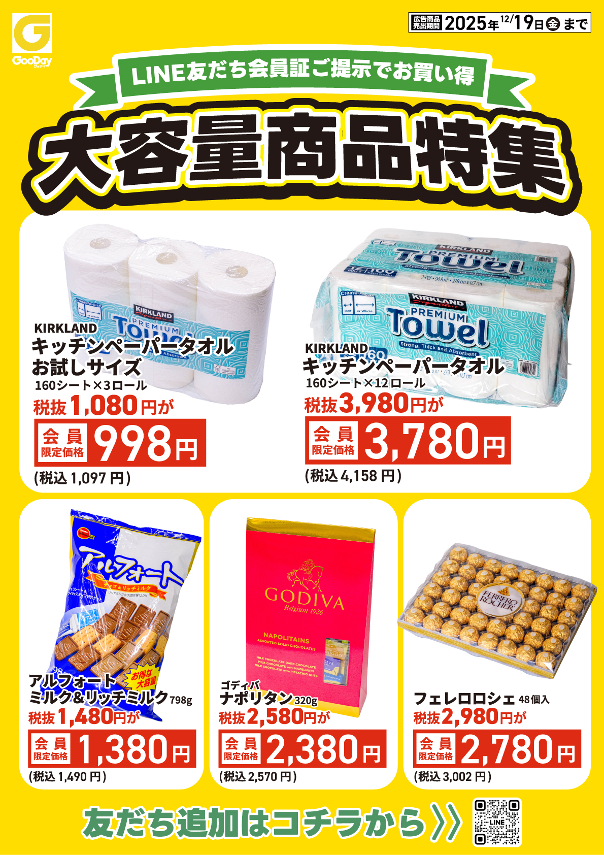 【LINE友だち会員証】のご提示で対象商品がお買い得に! たくさん入ってお買い得!大容量商品特集! 対象商品は今すぐ紙面をチェック▼