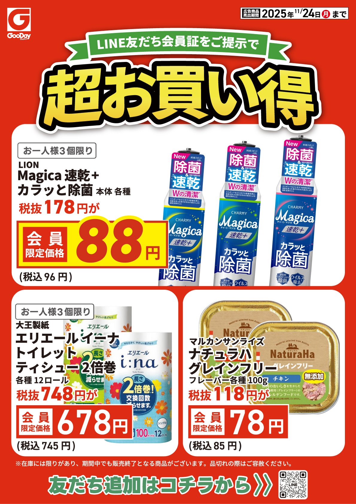 【LINE友だち会員証】のご提示で対象商品が『超お買い得』に! ぜひお近くのグッデイにてお買い求めください。 「詳細」からチラシ紙面をチェック▼