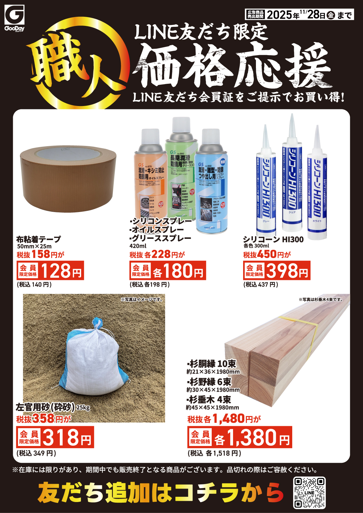 【LINE友だち会員証】のご提示で対象商品がお買い得に! 職人さんはもちろん!LINE会員であればみなさまお買い求めいただけます。 対象商品は今すぐ紙面をチェック▼