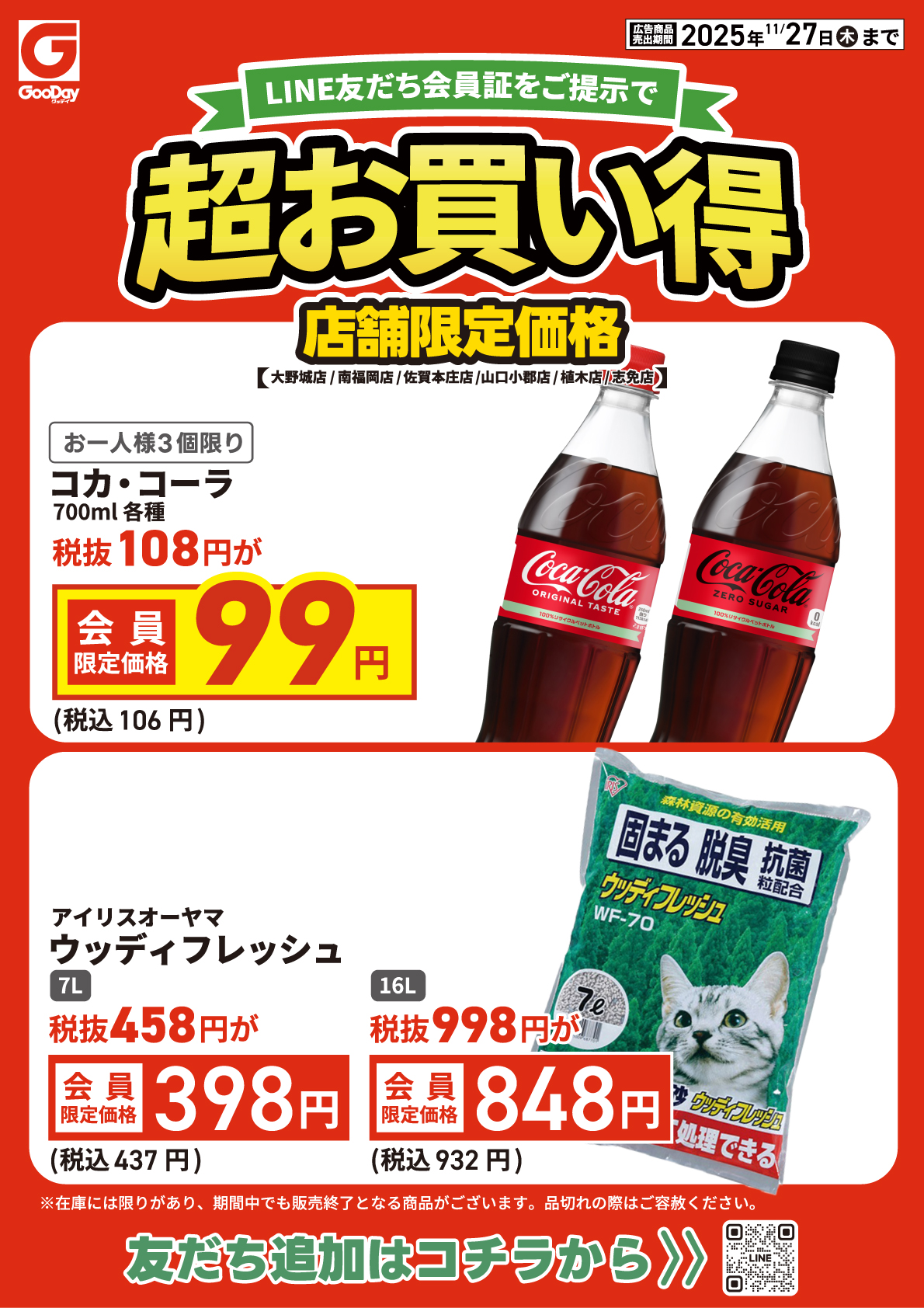 【大野城店・南福岡店・佐賀本庄店・山口小郡店・植木店・志免店】6店舗限定! LINE友だち会員証のご提示で対象商品が超お買い得に! 「詳細」から今すぐ紙面をチェック▼