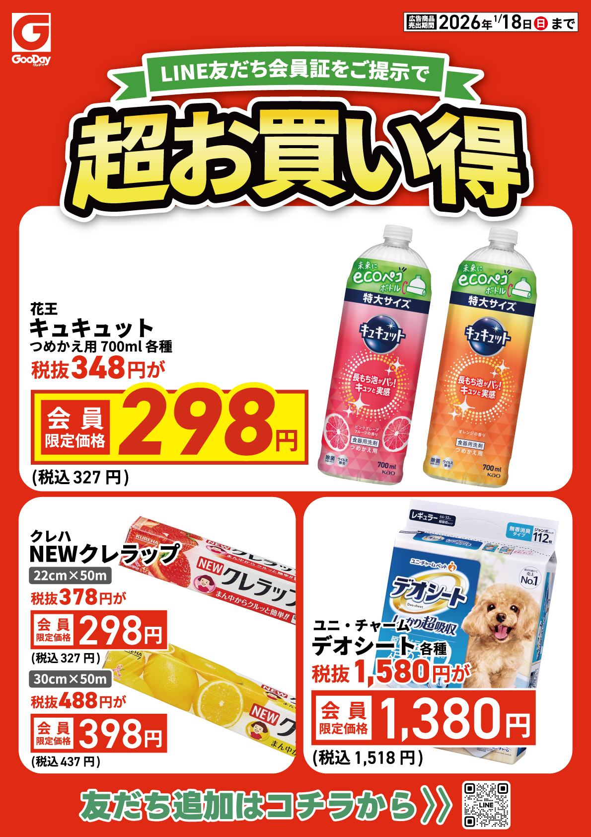 【キュキュット 詰替用】【NEWクレラップ】などが超お買い得! 【LINE友だち会員証】のご提示をお忘れなく! 「詳細」からチラシ紙面をチェック▼
