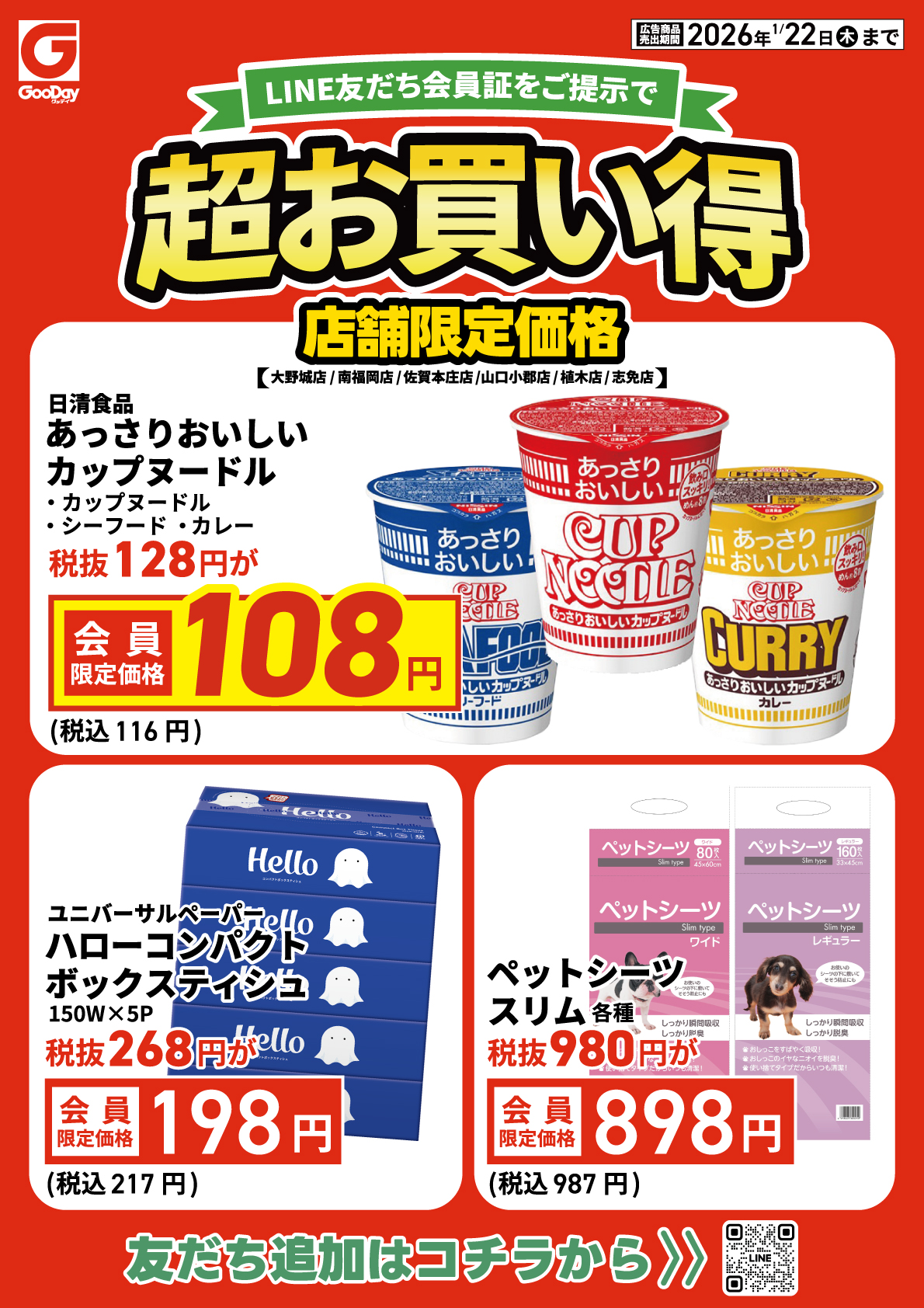 大野城店・南福岡店・佐賀本庄店・山口小郡店・植木店・志免店の6店舗限定! 【LINE友だち会員証】のご提示で対象商品が超お買い得に! 「詳細」から今すぐ紙面をチェック▼