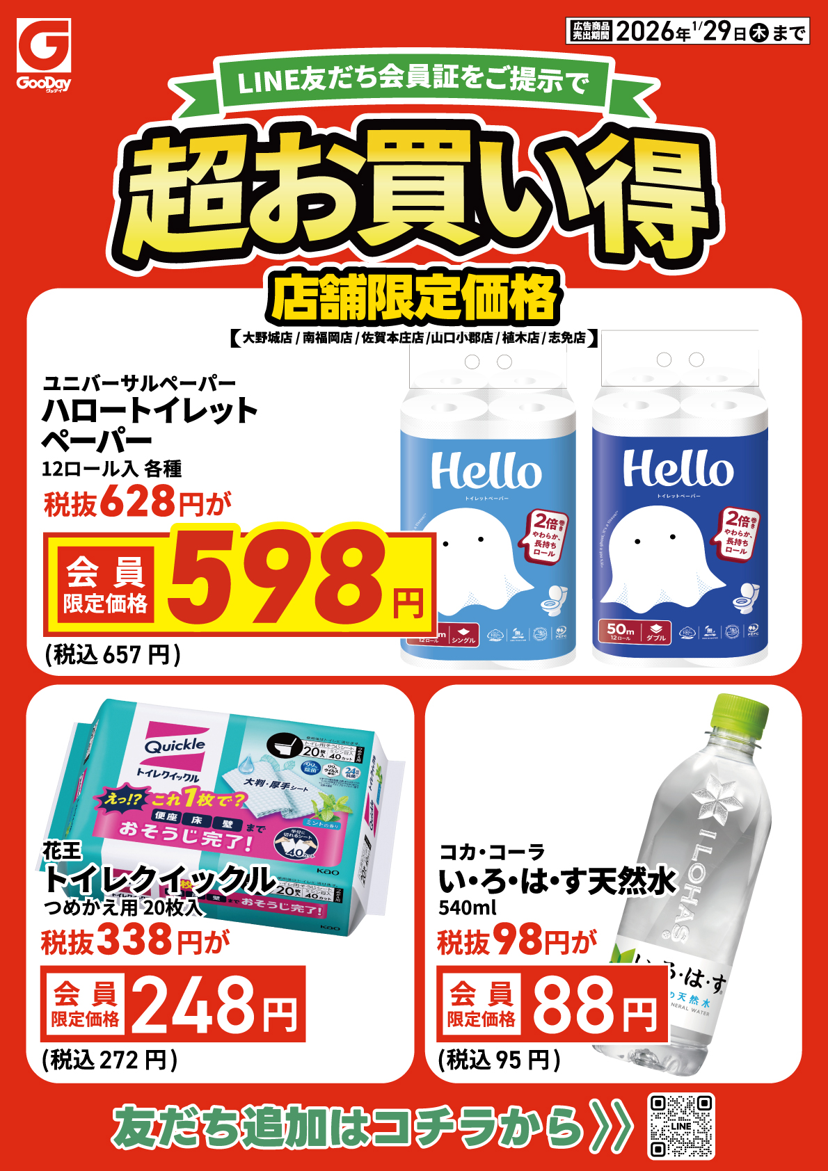 大野城店・南福岡店・佐賀本庄店・山口小郡店・植木店・志免店の6店舗限定! 【LINE友だち会員証】のご提示で対象商品が超お買い得に! 「詳細」から今すぐ紙面をチェック▼