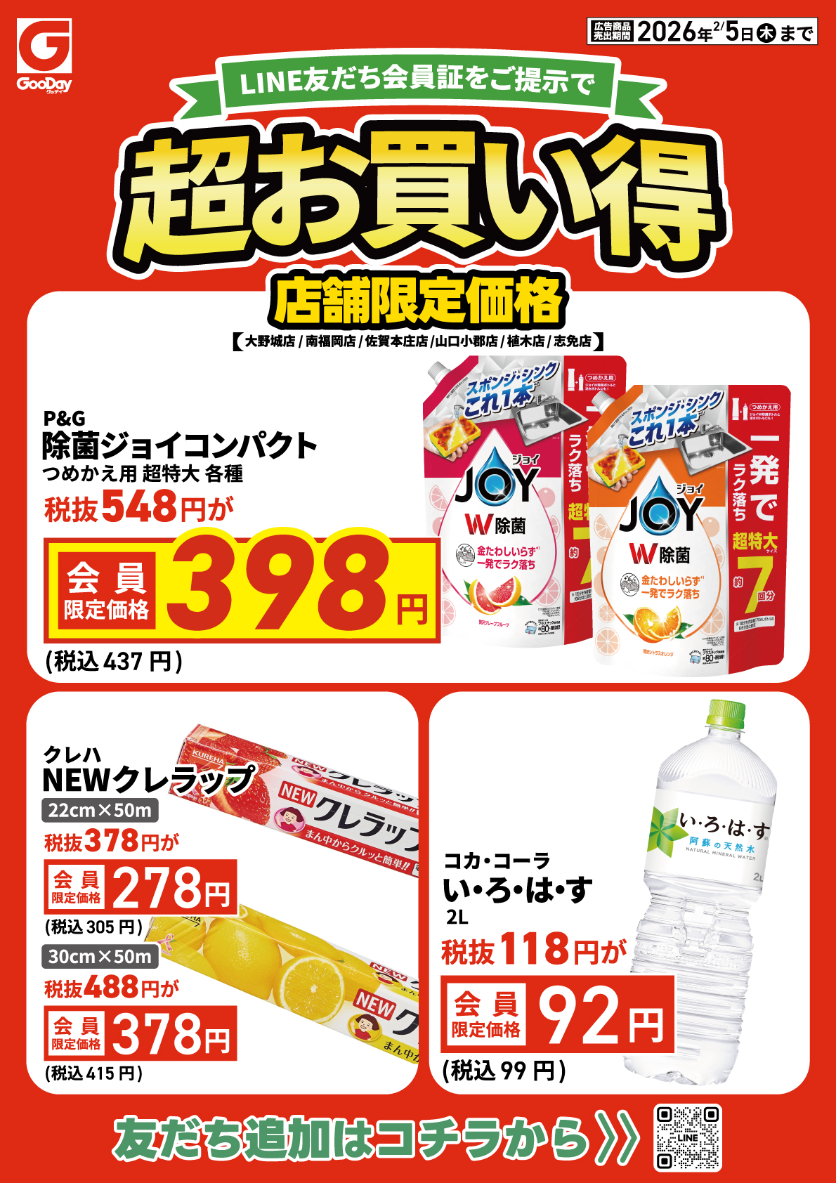 大野城店・南福岡店・佐賀本庄店・山口小郡店・植木店・志免店の6店舗限定! 【LINE友だち会員証】のご提示で対象商品が超お買い得に! 「詳細」から今すぐ紙面をチェック▼