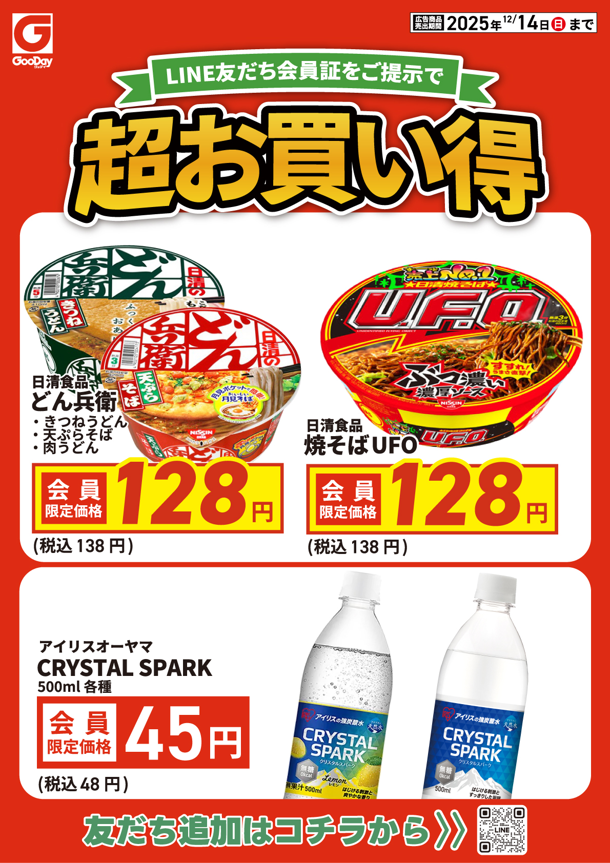 【LINE友だち会員証】のご提示で対象商品が『超お買い得』に! ぜひお近くのグッデイにてお買い求めください。 「詳細」からチラシ紙面をチェック▼