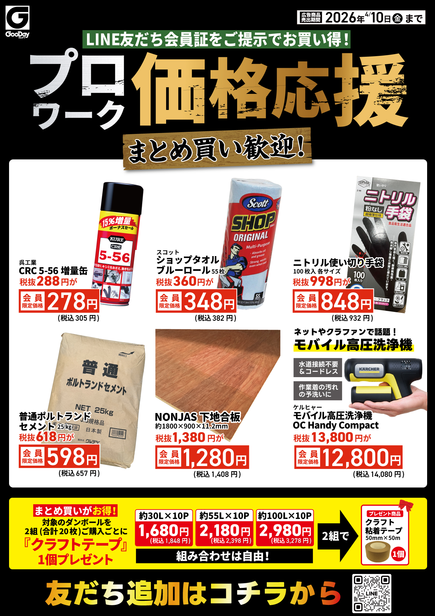4/6~10【会員限定】『プロワーク価格応援』チラシ 友だち会員ならお得にお買い求めいただけます! プロ利用の方も、DIY利用の方も、ぜひお近くのグッデイへ!