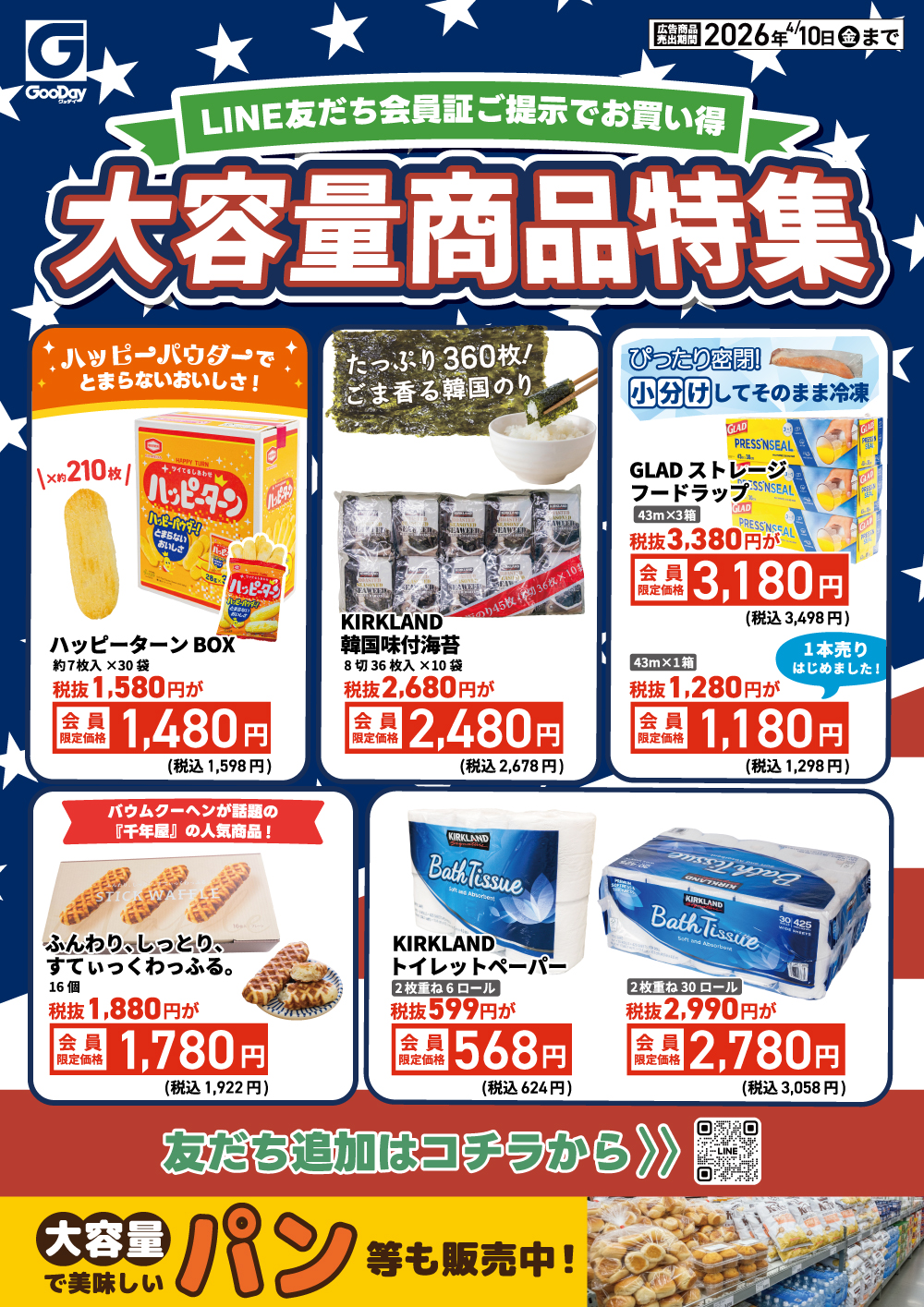 4/6~10【会員限定】『大容量商品特集』チラシ 【LINE友だち会員証】のご提示で対象商品がお買い得に! たくさん入ってお買い得!【大容量商品特集】