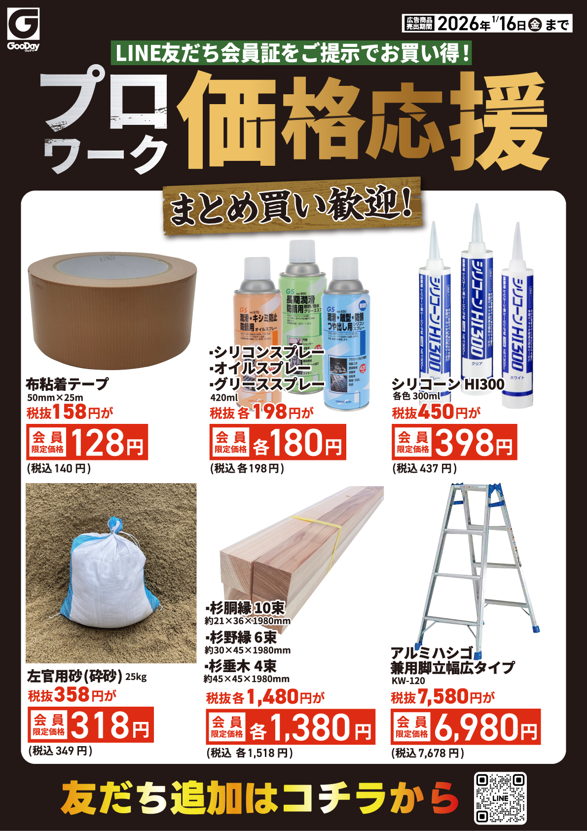 【LINE友だち会員証】のご提示で対象商品がお買い得に! LINE会員であればみなさまお得にお買い求めいただけます。 プロの方も!DIY利用の方も!ぜひお近くのグッデイへ! 対象商品は今すぐ紙面をチェック▼