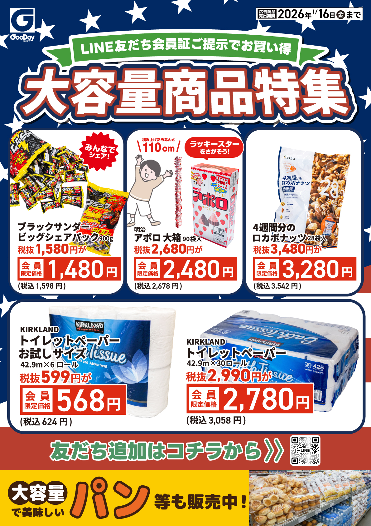 【LINE友だち会員証】のご提示で対象商品がお買い得に! たくさん入ってお買い得!大容量商品特集! 対象商品は今すぐ紙面をチェック▼