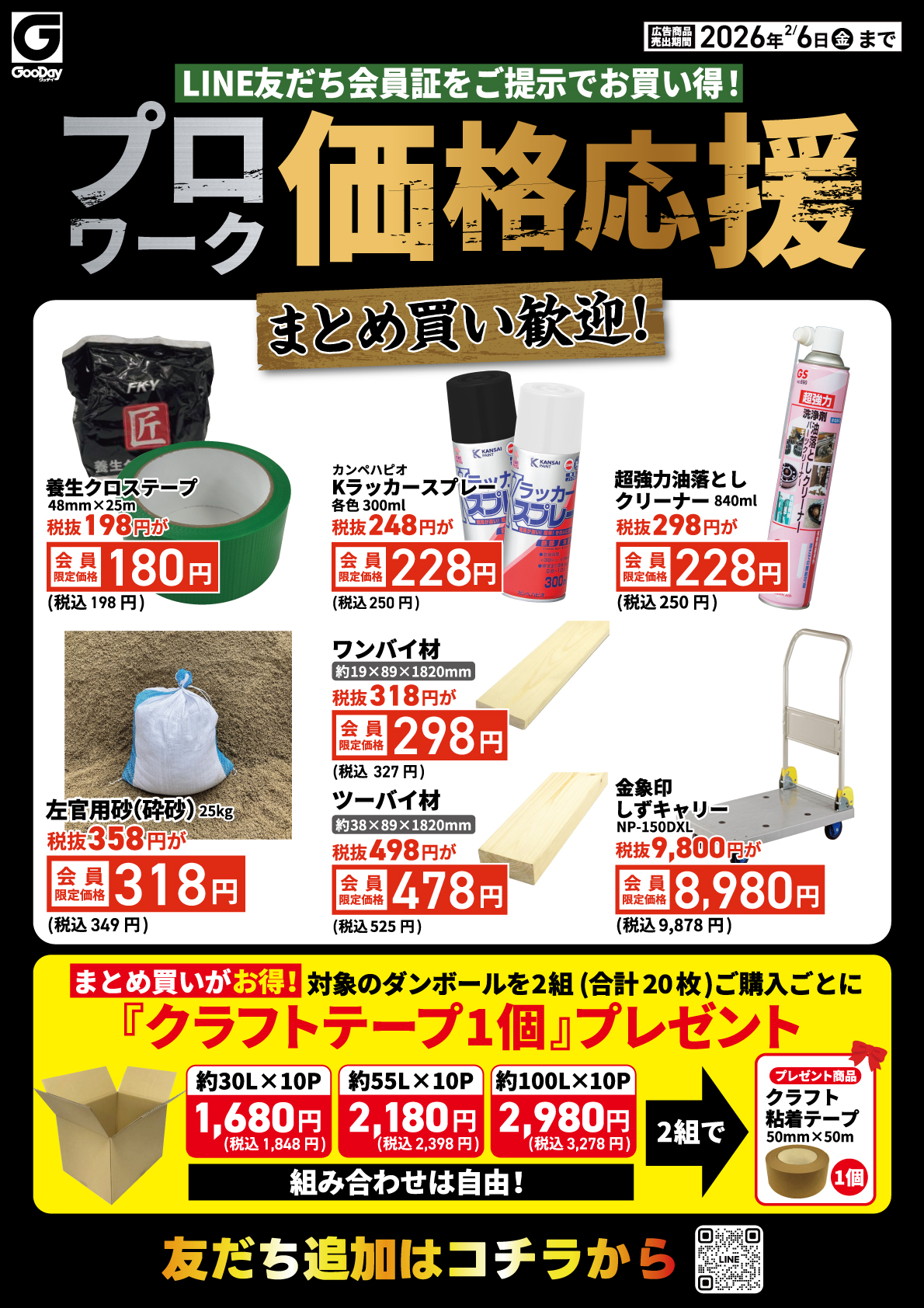 【LINE友だち会員証】のご提示で対象商品がお買い得に! LINE会員であればみなさまお得にお買い求めいただけます。 プロの方も!DIY利用の方も!ぜひお近くのグッデイへ! 対象商品は今すぐ紙面をチェック▼