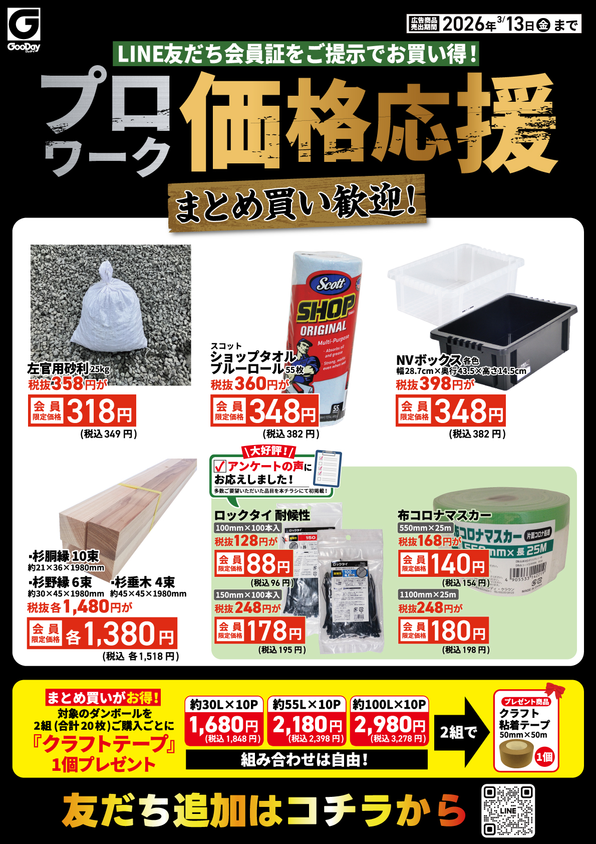 【LINE友だち会員証】のご提示で対象商品がお買い得に! 友だち会員であれば、みなさまお得にお買い求めいただけます! プロ利用の方も、DIY利用の方も、ぜひお近くのグッデイへ! 対象商品は今すぐ紙面をチェック▼