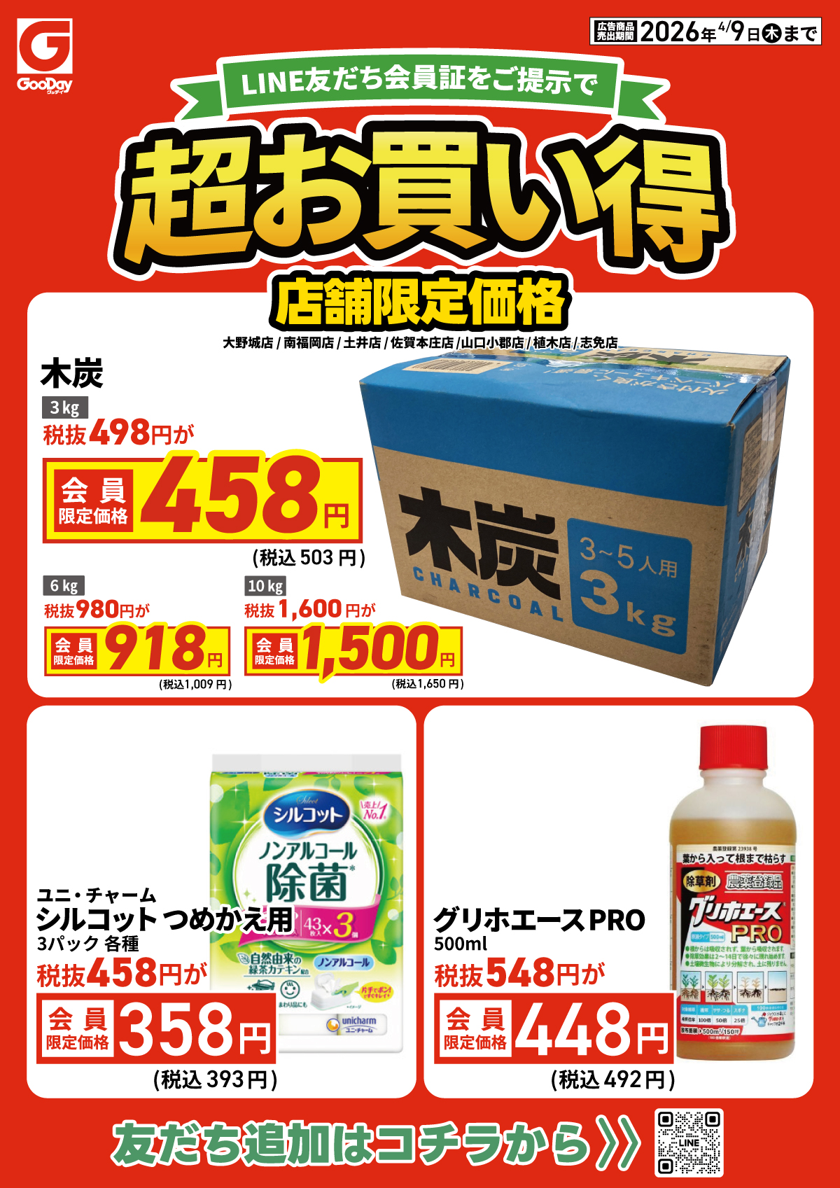 【会員限定】大野城店・南福岡店・土井店・佐賀本庄店・山口小郡店・植木店・志免店の7店舗限定『超お買い得』チラシ! 【LINE友だち会員証】のご提示で対象商品が超お買い得に!